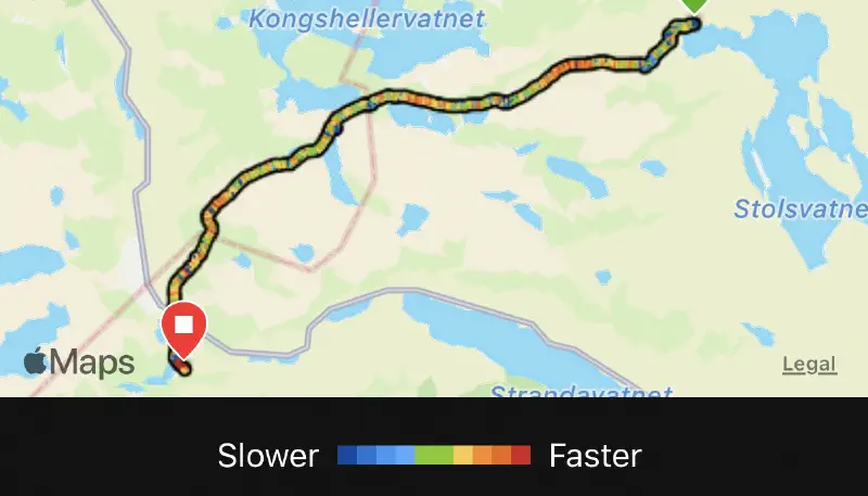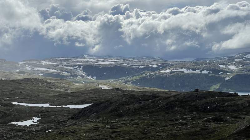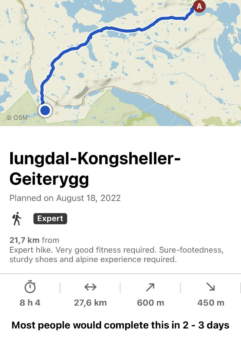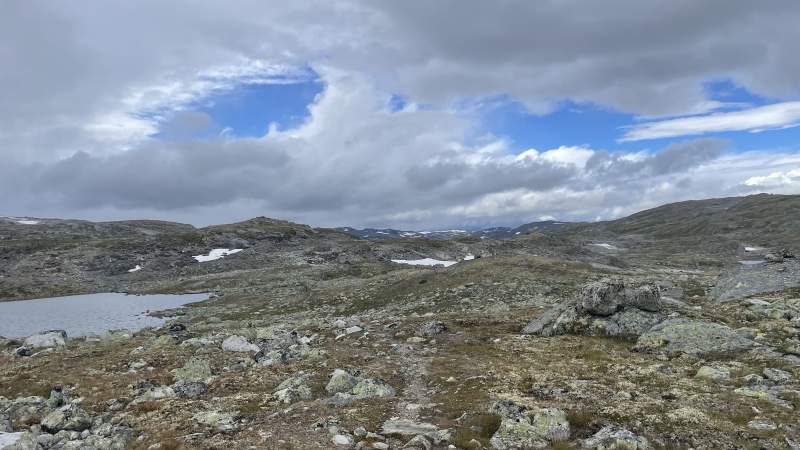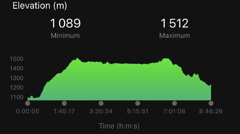 The section starts out with a steady ascent of roughly 400m over the first 8km, and then a relatively flat highlands terrain for the next 10km. Some rocky areas of large boulders as you approach Kongshelleren, and then a few more flat kilometres before a small ascent followed by a steady descent of ca 300m over the final 8km. Total ascent was 993m and total descent 865m. Max elevation of 1512m about 4km west of Kongshelleren.