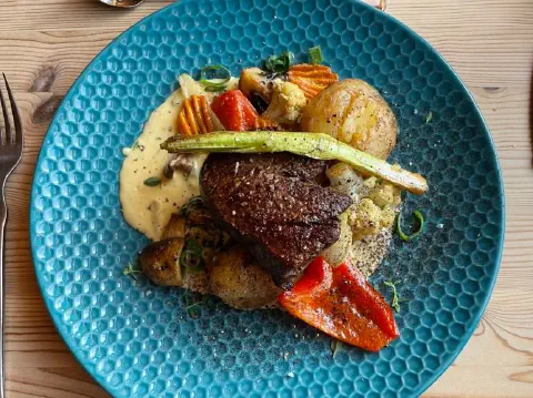 I’ve been privileged and lucky to dine exceptionally well during this expedition. Today’s meal at Dyranut Fjellstove is in a league of its own though. First some Baked Brie as an appetiser, followed by an exquisite chicken broth and tenderloin of deer for main course. All rounded off with crème brûlée. The chanterelle sauce with the main course was simply to die for. Nom! This place is most certainly worth making a detour for the food alone. Add to that, the room came with its own bathroom, shower and fireplace. Nice.
