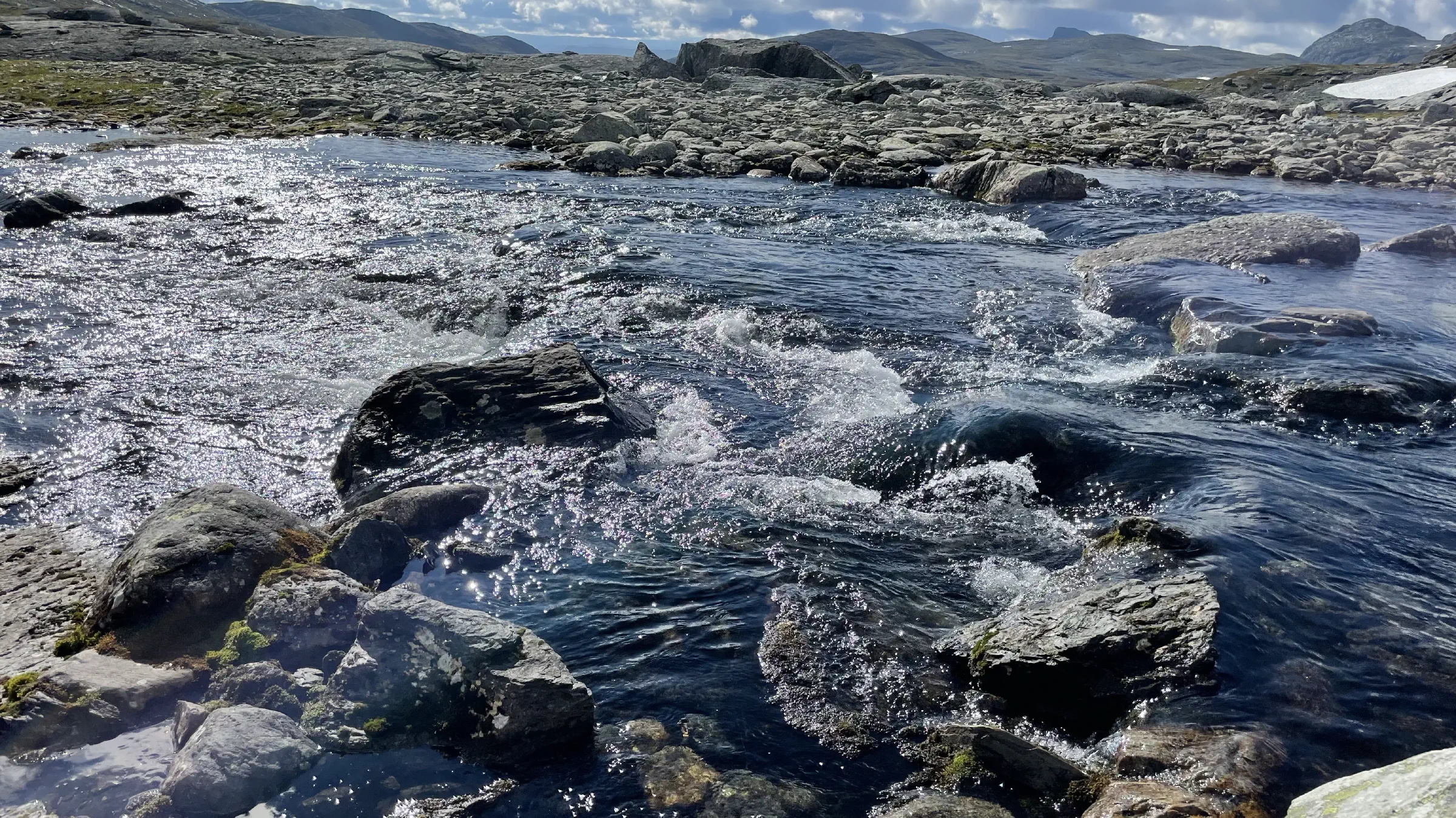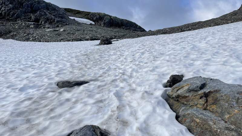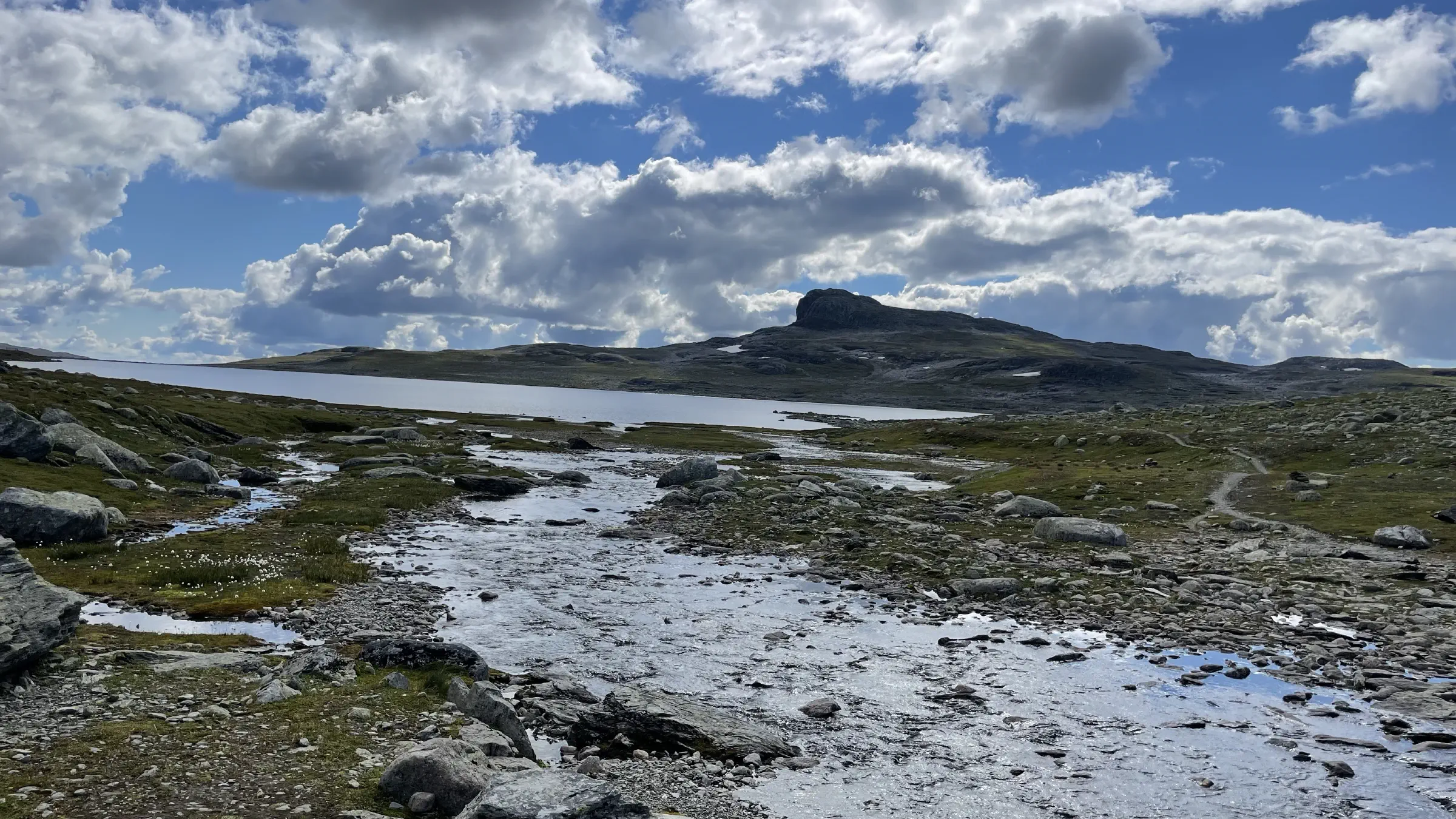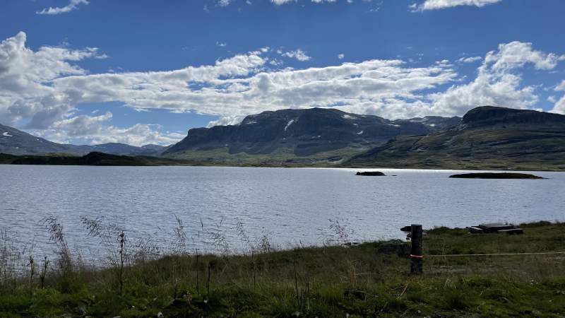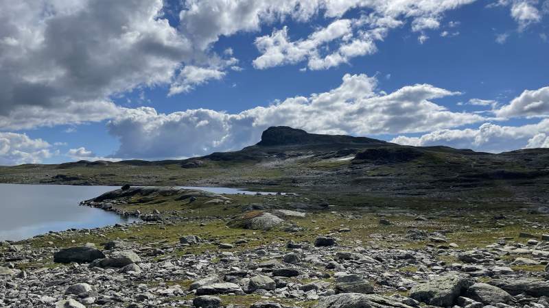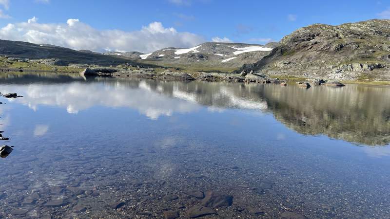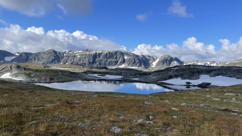 Today’s section was another beautiful section with sufficient hills and descents to offer variation without being too hard to hike. Total distance of 22.71km was completed in six and a half hours, with an ascent of 743m and descent of 918m. The highest point at 1390m just west of Årmoteggi after about seven kilometres. The track is varied and includes some snow-covered areas, some quagmire, some massive boulders and a lot of views.