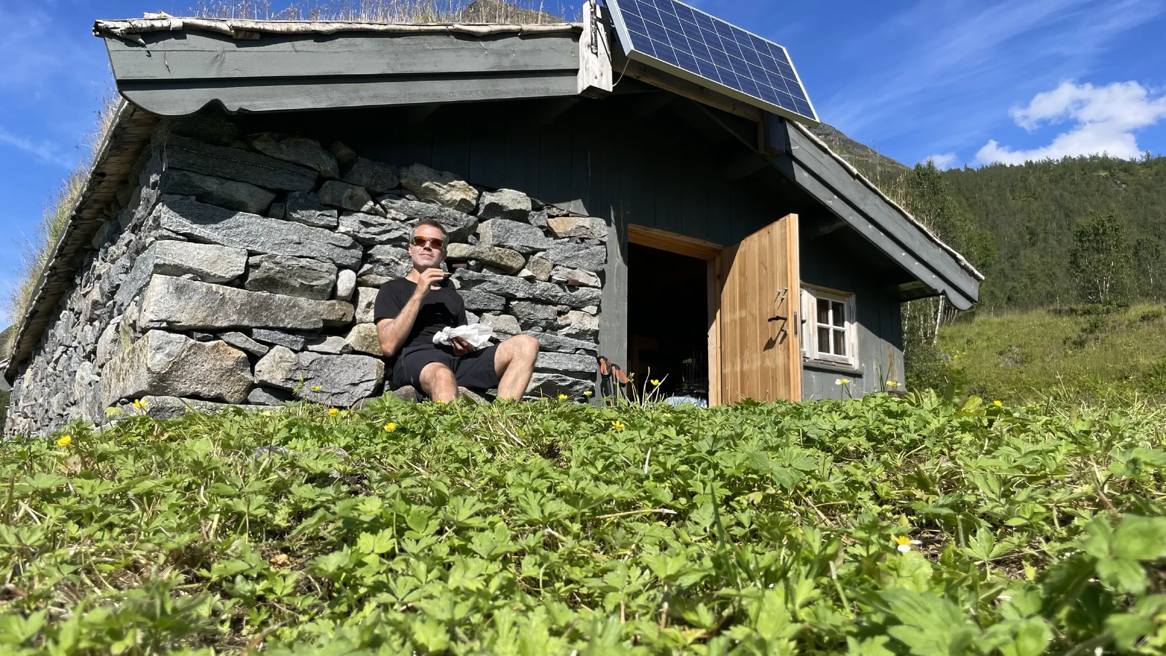 As I’m writing this I’m sitting baking in the sun outside my stone cabin, barely a cloud in sight, watching the majestic mountains and the valleys of the green and the grey in between. Listening to The Beatles’ Here Comes The Sun. And right in front of me, a freshly cut green meadow. Here’s the view: