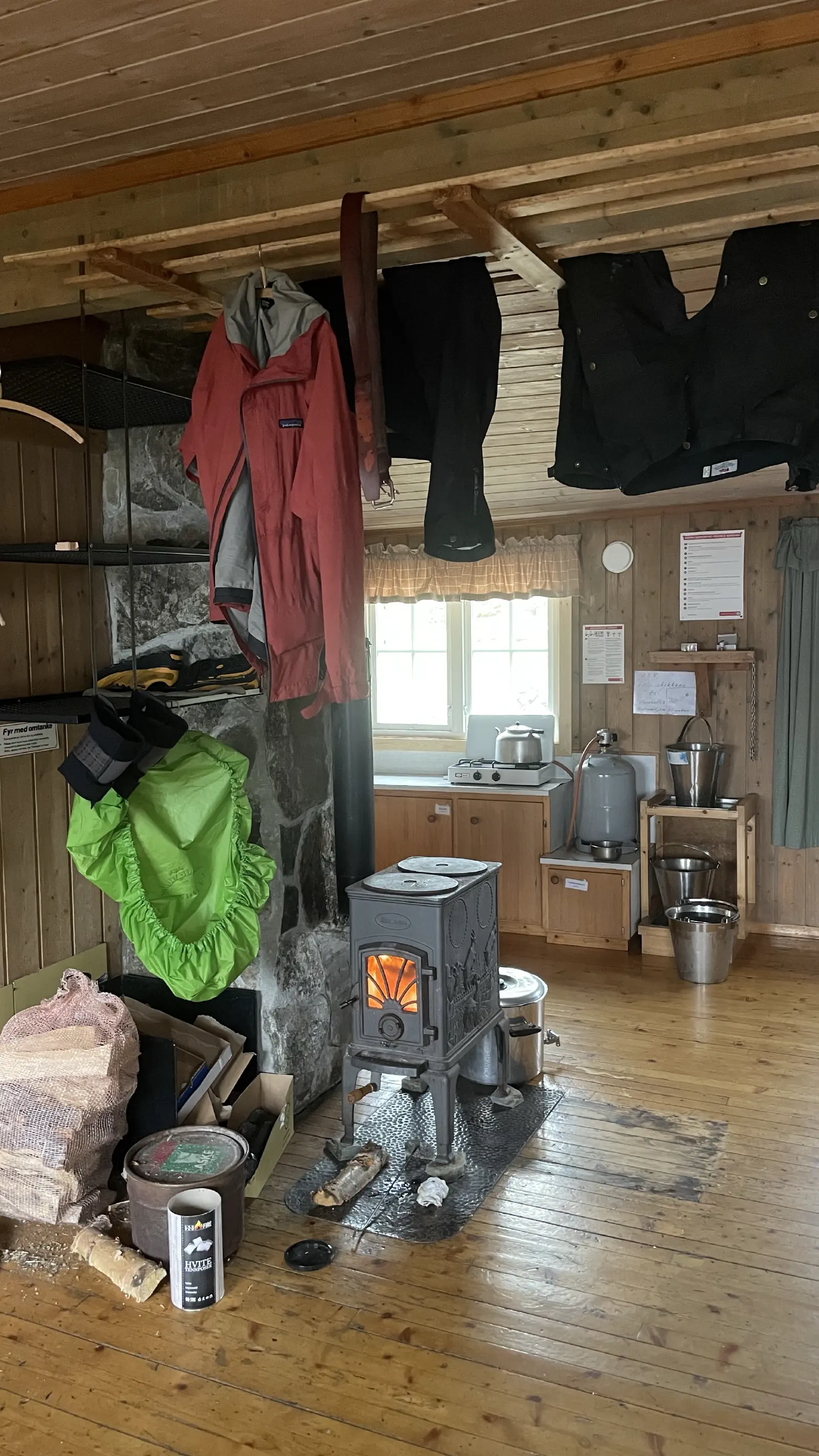 Delighted to find the cabin empty, which means I could be lucky and have the place to myself tonight. No rest at the self service huts though, so have collected water, fire wood, got the fire started, hung my soaked clothes and shoes to dry, and got the water boiling. More pictures of the cabin in the gallery below. Now getting ready for a Real FieldMeal for dinner and then off to yet another early night.