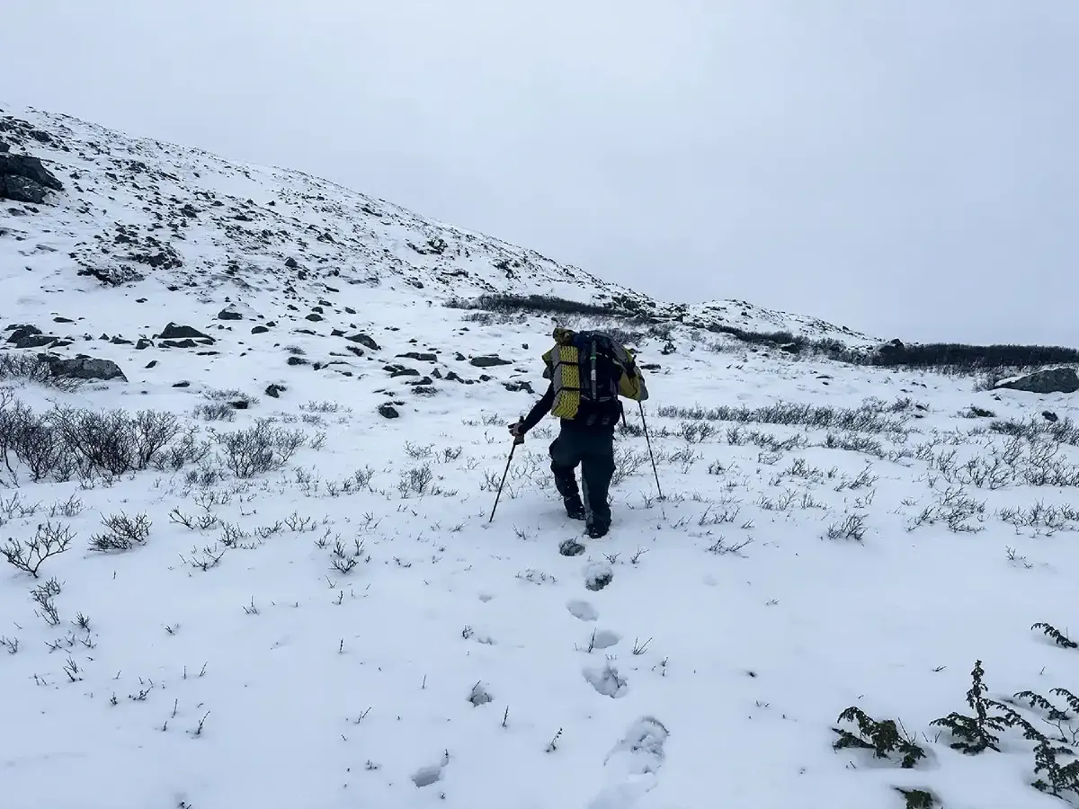 The hike involved a 1,200m ascent to Nordre Dyrhaugstind, where we planned to leave our tent and overnight equipment. Usually, this section isn’t strenuous. However, the knee-deep snow and hidden boulders made it tough. We had to be extremely careful with each step. One wrong move could mean hitting a hidden boulder and risking a broken ankle or leg. To avoid getting too sweaty-since even wool gets cold when wet-we deliberately maintained a slow pace. The goal was to keep a slow and steady speed at roughly 3 km/h moving speed and plenty of breaks.
