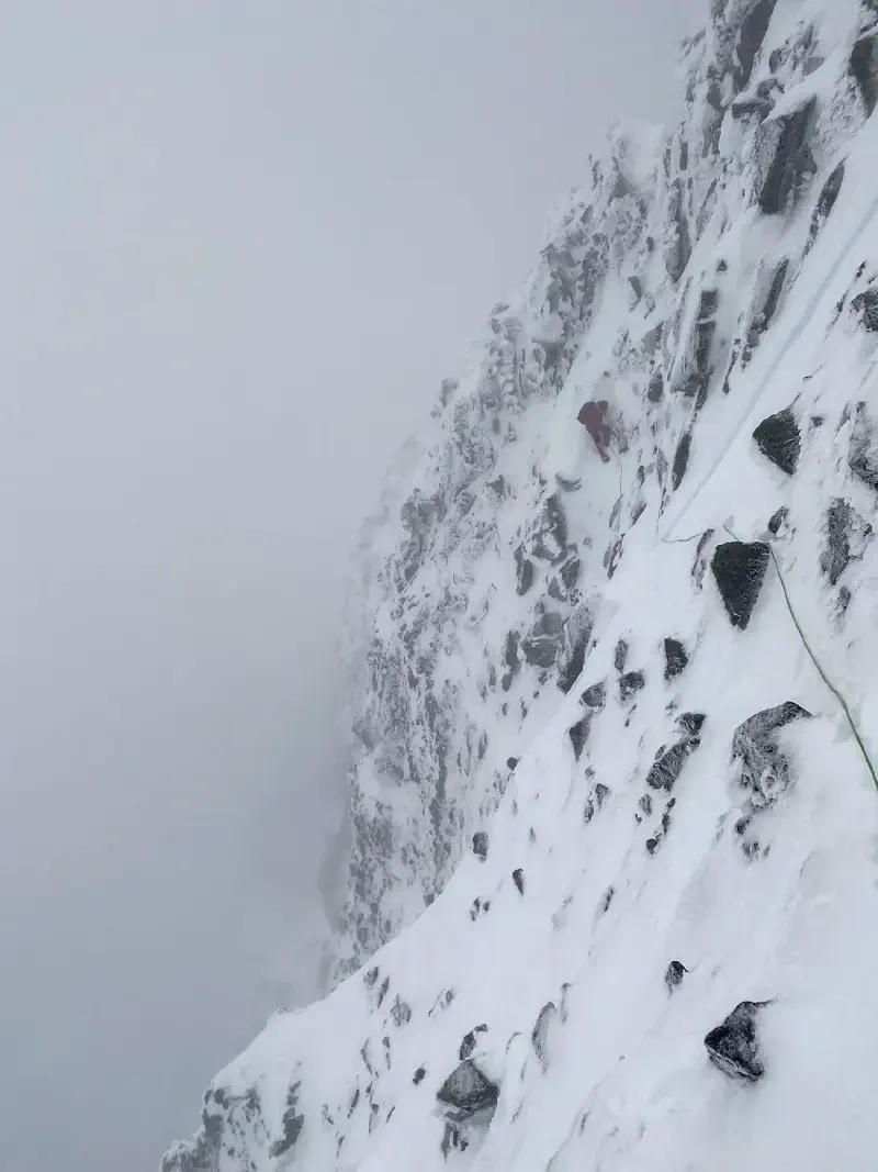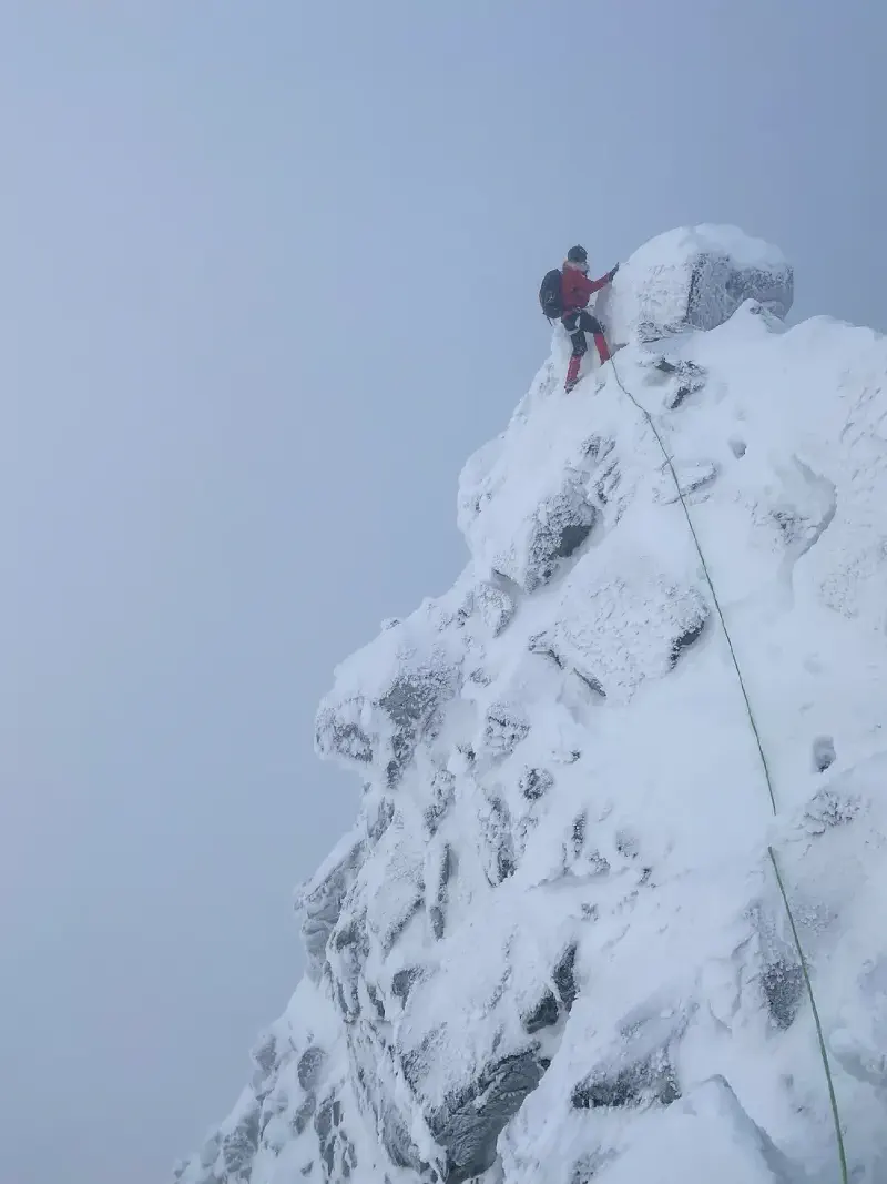 One of the main hazards and difficulties in winter climbing lies in identifying reliable anchor points beneath layers of snow and ice. Additionally, it’s crucial to ensure that any rocks used are genuinely secure, rather than merely superficially frozen to the surrounding terrain.