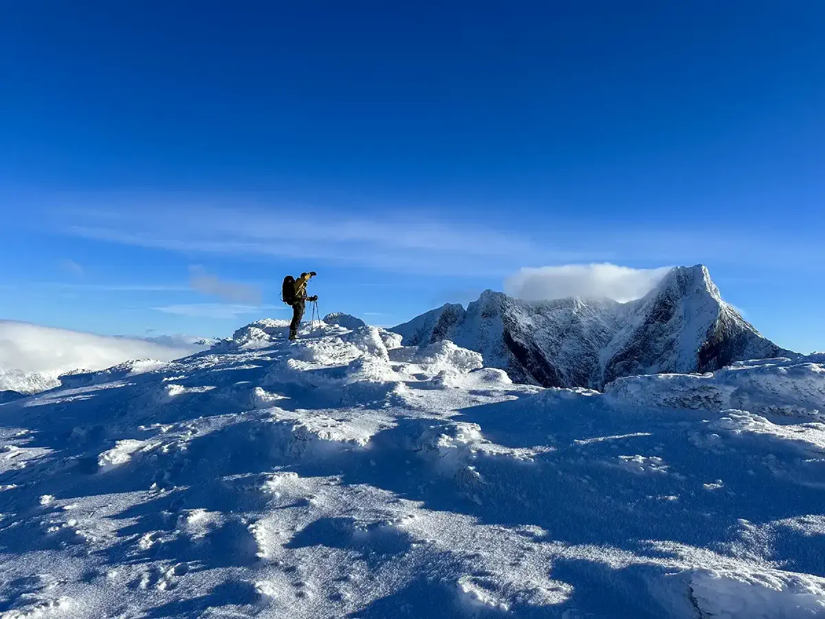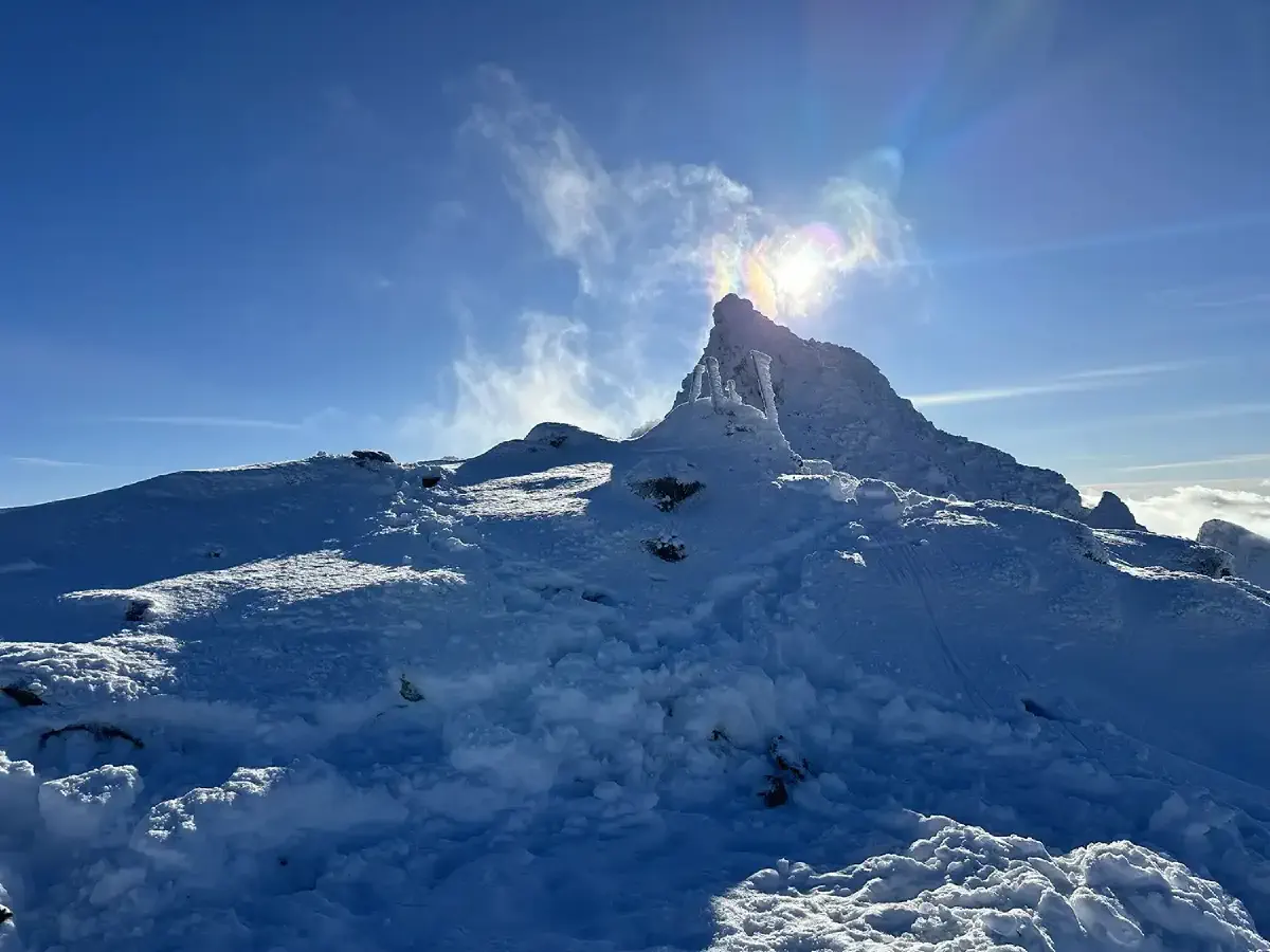 Route setting is not particularly hard. You merely follow the ridge southbound towards the summit. At the final summit, you have the choice between ascending towards east or west. From a climbing perspective, it’s relatively simple. However, the snow and ice add complexity both from an anchoring and foothold perspective.