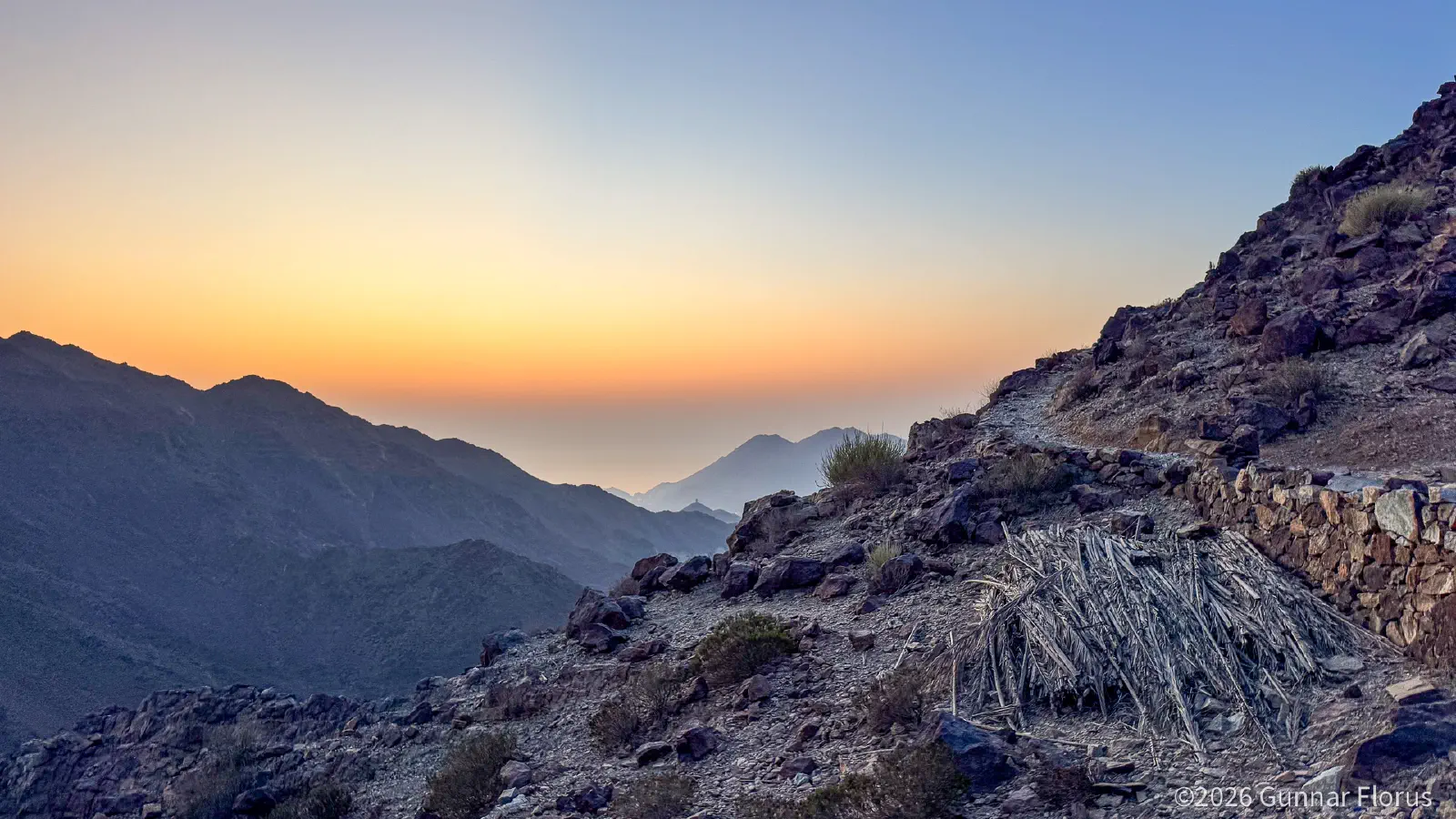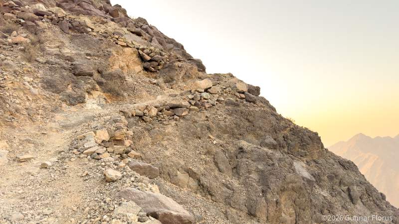 The Hajar Mountains are made of ophiolite, ancient oceanic crust thrust onto land around 70 million years ago. For hikers, the surface behaves differently from the solid gneiss and granite of Norway. Heat and wind have created a brittle outer layer that peels and breaks away underfoot. Expect sharp, unstable rock and loose flakes. In Hurrungane, there is plenty of rocky terrain, but the bedrock stays put. The danger is exposure. A fall means a long way down. Here, the mountain itself is the hazard. You are less likely to fall hundreds of metres, but the ground is more likely to shift beneath you. If you do fall, the landing is much sharper. This is an accessible, well-maintained trail with stone steps along the way. Neither steep nor long, it suits hikers of most abilities.