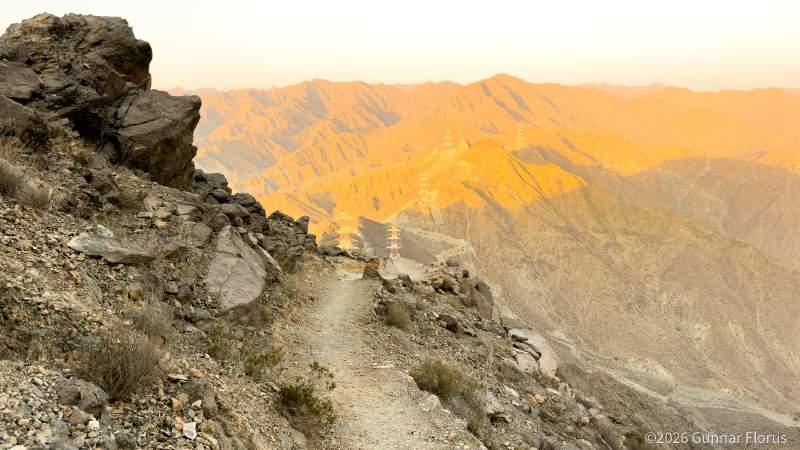 The path is clearly marked and hard to miss. A doable hike for most, regardless of fitness or experience. Total ascent is a mere 500 meters distributed relatively evenly across the roughly 3.5km in each direction. There are some truly spectacular sights along the way, making the effort worthwhile. From the car park, you look down on Al Rafisah Dam and the mountains beyond. Higher up, Khor Fakkan reveals itself against the Arabian Sea.