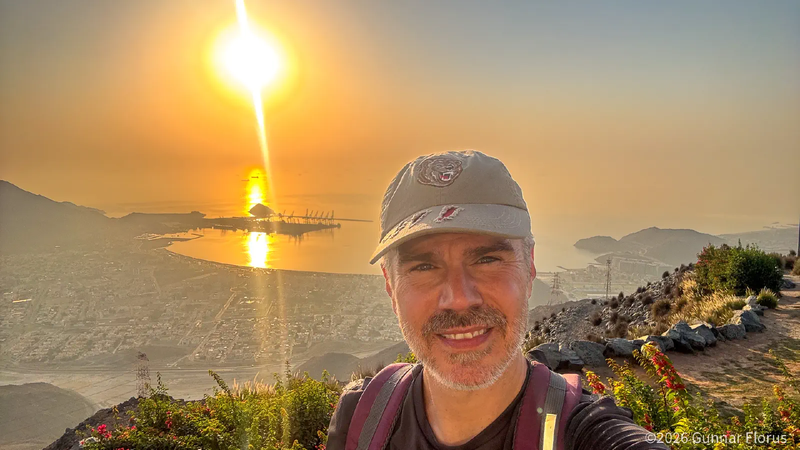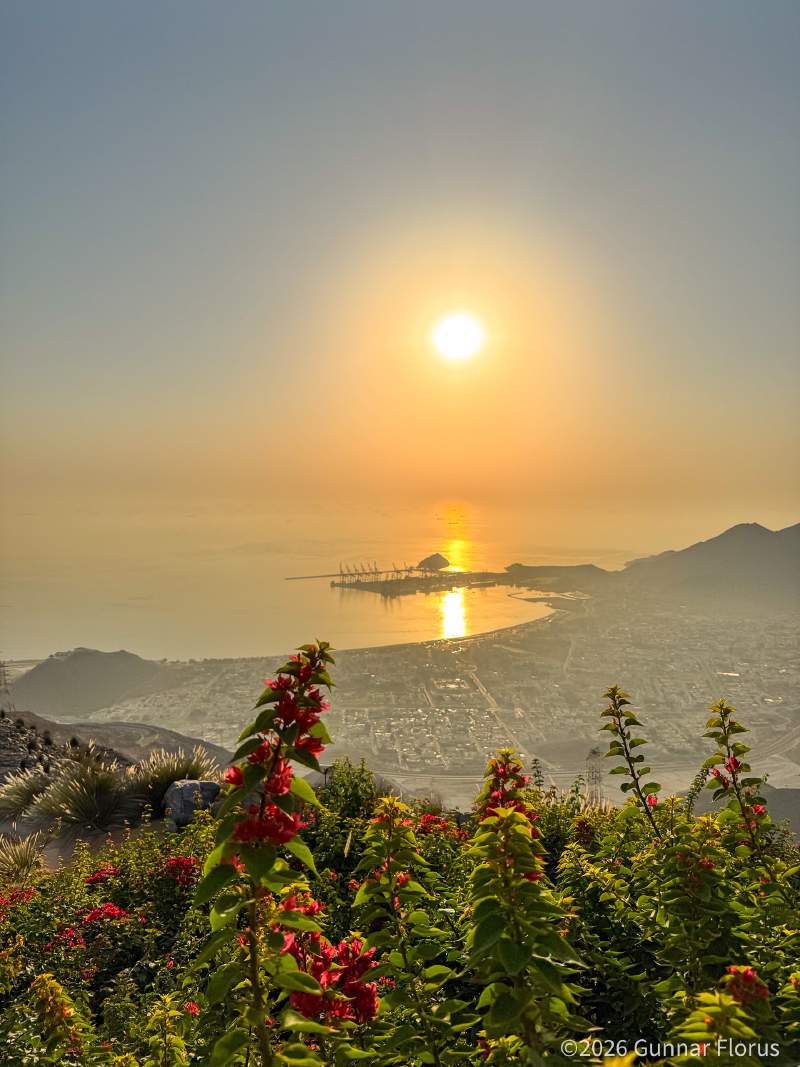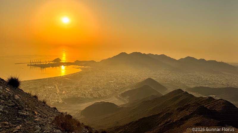 Jabal al ‘Uwayyin lies in Khor Fakkan, an exclave of Sharjah wedged between the Gulf of Oman and the Emirate of Fujairah. It is Sharjah’s only access to the eastern coast, a bit over an hour by car from Dubai. The town sits at the foot of the Hajar Mountains, just a few kilometres from the sea. Jabal al ‘Uwayyin rises to around 580 metres above it, the highest peak in the immediate area, with a prominence of just over 230 meters. Without offending my Emirati friends, this barely qualifies as a mountain by Norwegian standards. That does not make it any less beautiful. The area and views are spectacular!